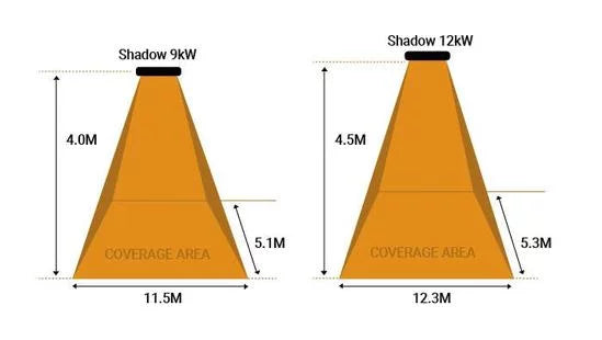 The Shadow 9kw or 12kW offers a flexible design that allows it to be mounted almost anywhere, so you can maximise its heat output and ensure it is running to its full potential. This infrared heater has been operated in a number of different settings, including indoor sports venues, churches, large factories, zoos, shopping malls and many more.